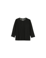 The PHEDRE 3/4 Sleeve Blouse, made from lace fabric, plays with transparency at the back and is lined at the front. The model has 3/4 sleeves and a buttoned opening at the back. The PHEDRE Lace Blousefeatures a round neckline and a straight cut that suits all body types. The delicate details, such as the lace finishes at the neckline and the sleeve hems, make it a refined and sophisticated piece.