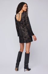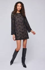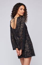 The Hannah dress is made of corded stretch lace and is fully lined for ease of wear. Features include a low back neckline with tie detail and lace trim detailing along the sleeve and body hem.