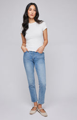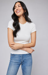 The Madison is a fitted crewneck tee made of a stretchy ribbed fabric that hugs the body. It’s an essential layering piece that can be easily dressed up or down.