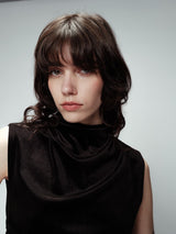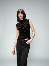 Crafted from velvet fabric, the ODESSA sleeveless top features a draped effect around the bust that adds contrast and movement to the silhouette. The fitted cut of the design accentuates the waist, while the draping enhances the figure. The intricate details, such as the high neckline and side ruching, make it an elegant and sophisticated piece. The ODESSA velvet top has cap sleeves and a back zipper closure.