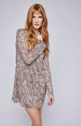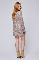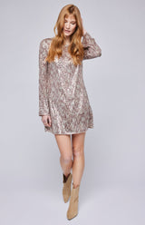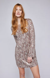 The Zadie dress is made of a patterned sequin fabric that has the perfect amount of drape. Features include body lining and piping details along the sleeve and body hem.