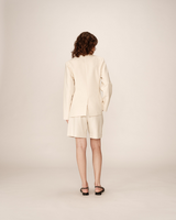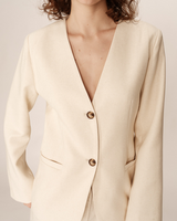 Grace & Mila puts a unique twist on a classic piece from the feminine-masculine wardrobe with the PAYTON tailored jacket. With its clean lines and minimalist cut, this piece creates an elegant and sophisticated silhouette. The PAYTON long-sleeved jacket is collarless, features a single button closure, and has piped pockets in the front. The fitted cut and V-neckline enhance the femininity of the design and flatter the silhouette.