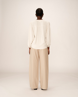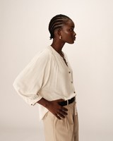 The PORTRAIT long-sleeved blouse is a casual and feminine model, pleasant to wear. Light and fluid, this piece embodies casual elegance while enhancing the feminine silhouette. The casual PORTRAIT blousefeatures long sleeves and a button placket at the front. The refined details, such as the Mandarin collar and front gathers, highlight the elegance of the piece.