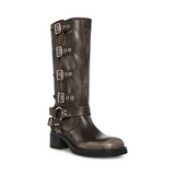 The BROCKS knee LEATHER boot features the wide profile of an engineer boot with harness and buckle hardware adding an industrial edge and giving the design an adjustable fit.
