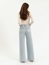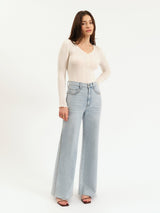 The Far Out in Let's Dance is a high-rise wide leg in a classic light blue wash, featuring studs along the side seams for a touch of cool. Keep it 100 - this jean is constructed from 100% cotton.