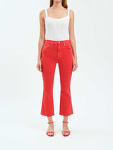 The Shy Girl in Cherry is a flirty high rise cropped kick flare jean in a vibrant cherry red hue. Pair with the Lily Baby Tee in Cherry for a bold monochromatic look. This statement jean is constructed from our Just Right fabric, a reliably flattering cotton blend that provides the perfect mix of rigid and stretch.