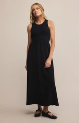 This maxi dress has that perfect mix of fitted and airy. The ribbed cotton modal bodice hugs just right, while the textured rayon skirt flows with every step. Finished with a high neckline, sleeveless shape, and hidden pockets because yes, we’re keeping it functional too.