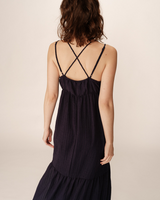 The PRETTY long dress is lined and made from a lightweight, fluid striped fabric that creates a flowing and airy silhouette. The intricate details, such as the ruffled finish at the neckline and the ruffles at the hem, highlight the bohemian and romantic inspiration of the PRETTY long dress. The open neckline and thin, adjustable straps crisscrossing at the back give the dress a decidedly feminine and refined look.