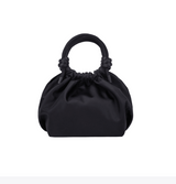 Mini handle bag with magnetic closure and knotted detailing on the handles. The bag has one compartment with one zipper-closed inner pocket.