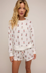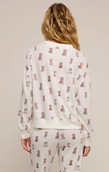 Celebrate your love for pups with this relaxed crew neck top, featuring an adorable allover dog print on brushed sweater knit fabric. Soft, cozy, and packed with personality, it’s the ultimate way to add a playful touch to your lounge lineup.