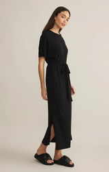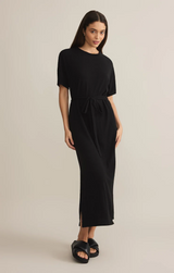 This relaxed midi dress, made from soft cotton slub jersey, features a casual crewneck and short sleeves. With a tie at the waist, it can be styled belted or unbelted, offering two looks in one for versatility.