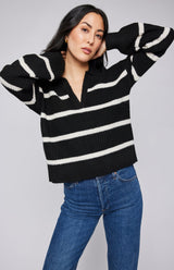 The Beckett sweater is made of a soft yarn in a ribbed knit pattern. Features include a two-tone stripe and collar for a casual yet elevated look.